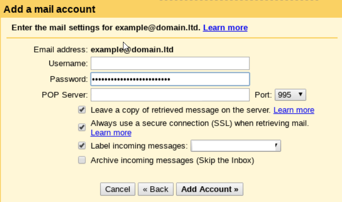 Make sure “Always use a secure connection (SSL) when retrieving mail“.