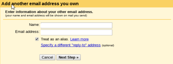 2. Enter the recipient’s name and full email address. Adding another address to your Gmail account for sending messages typically affects the method of sending messages the same as adding an alias to your original Gmail address. In cases where you’re sending on behalf of another person, it may be a good idea to uncheck the Treat as an alias box and then to choose “Next step”: