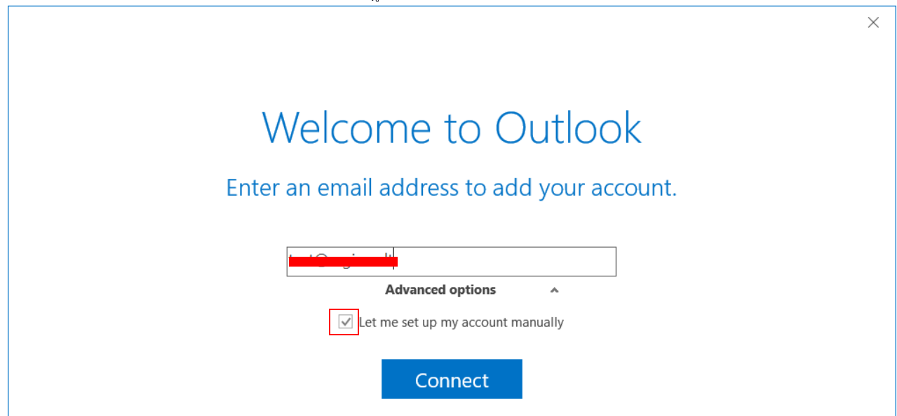 Step 3: Type in your Email address and then press “Advanced Options” -> check “Let me set up my account manually“.
