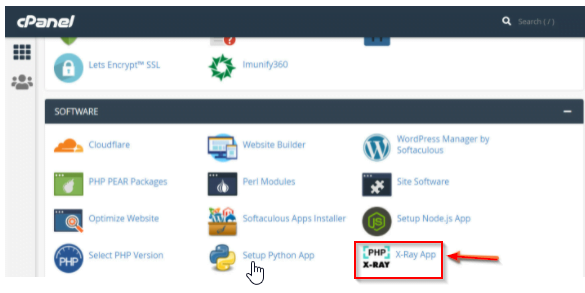 Step 1: Open your cPanel account. Open the X-Ray App after you log in to the Software section.