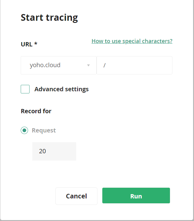 - “Record For” specifies the number of requests the trace will last for. If there are 20 traces, then for the next 20 times someone visiting your website (adding it to their browser or console) a trace will be triggered.