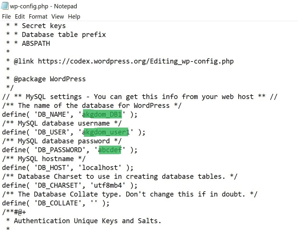 - Then, find and replace the DB_NAME, DB_USER, and DB_PASSWORD selected with the database names, usernames, and passwords created in step 7: As illustrated below: